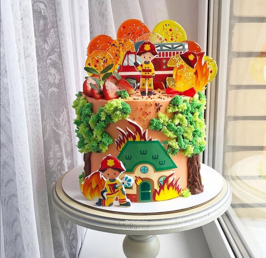 Юные любители больших красных машин и смелых пожарных будут прыгать от радости получив в подарок такой яркий тортик